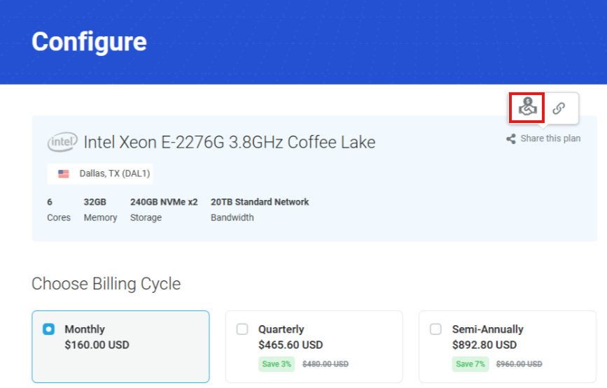 2.Click the Order button, select the server you want to share with your referee, then click Share This Plan for the referral.